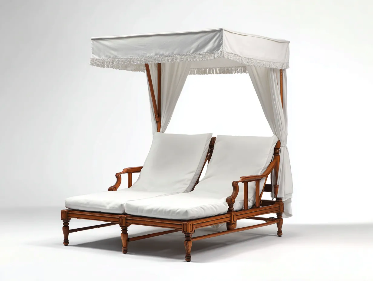 La structure est réalisée en bois, offrant une stabilité fiable et une résistance adaptée à un usage extérieur. Les surfaces de repos et l'auvent sont habillés d'un tissu blanc, apportant une sensation douce au contact et une harmonie visuelle avec le cadre en bois.