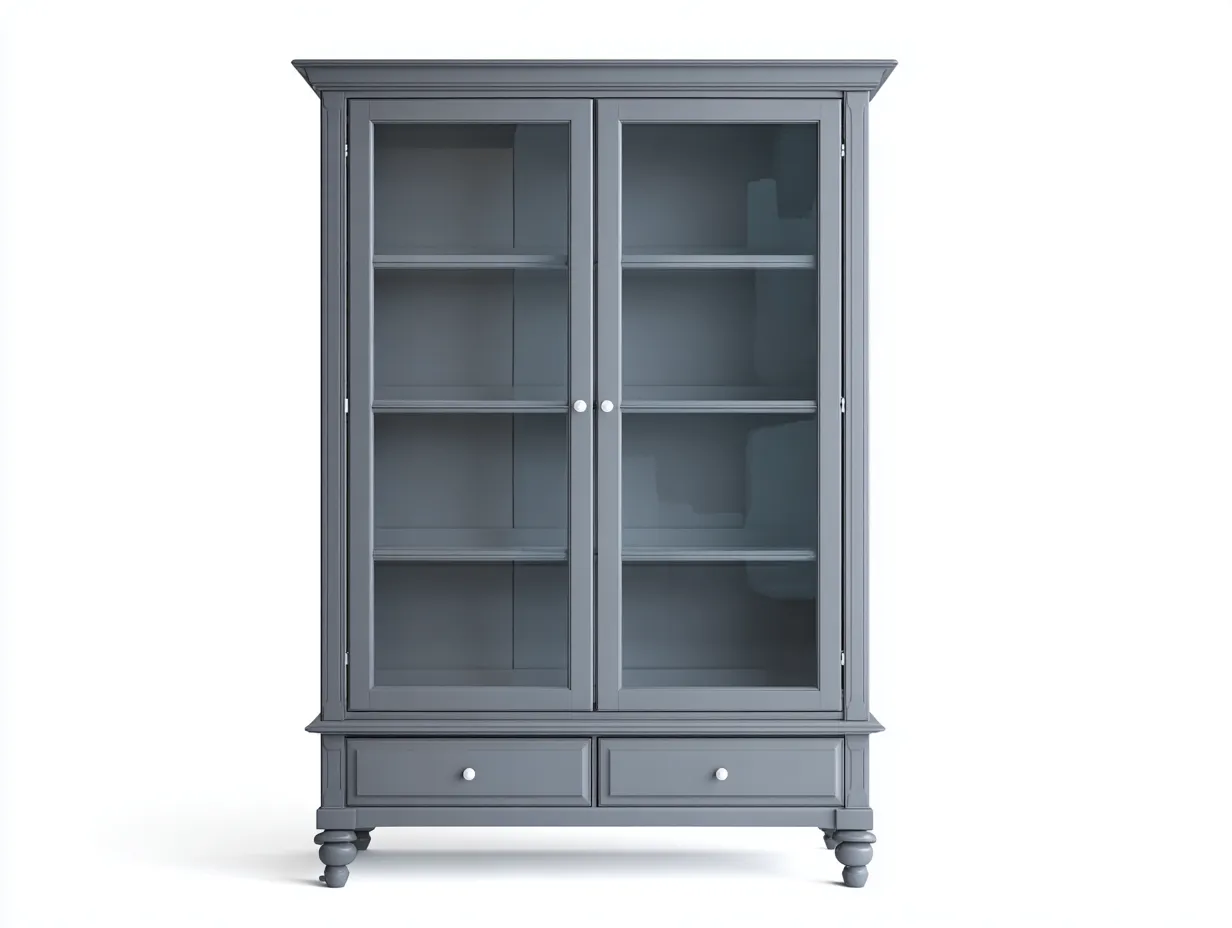 Les portes vitrées protègent les objets tout en les mettant en valeur. Les étagères intérieures permettent une organisation claire et pratique des éléments exposés.